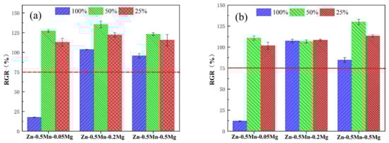 Figure 12 illustrates the evaluation of the extract concentration and the RGR value of L-929 cells at various culture times. With the exception of the alloy with the least amount of magnesium, which had a lower relative growth rate value when the concentration of the extraction liquid was 100%, those of the rest were above 75%. Among them, Zn-0.5Mn-0.2Mg showed better cytocompatibility, indicating that a small amount of magnesium was beneficial to cytocompatibility [36]. In general, the relative growth rate value decreased over time.