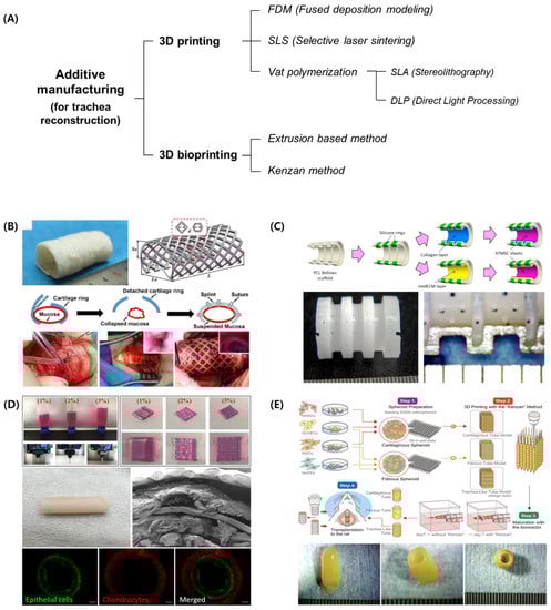 Additive manufacturing technologies utilized to reconstruct the trachea. (A) Classification of the additive manufacturing technologies. (B) Tracheal constructs using selective laser sintering. (C) Tracheal constructs using stereolithography. (D) Tracheal constructs using extrusion-based bioprinting. (E) Tracheal constructs using the Kenzan method. (Figures were reprinted with permission from Ref. [], Elsevier [,]).