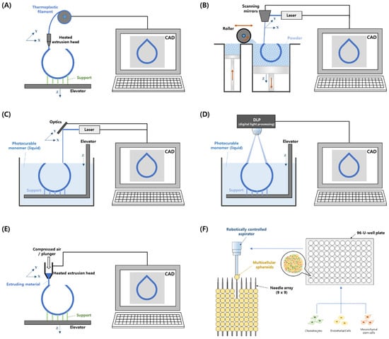 Schematic of additive manufacturing technologies for tracheal reconstruction. (A) Fused deposition modeling. (B) Selective laser sintering. (C) Stereolithography. (D) Direct light processing. (E) Extrusion-based bioprinting. (F) Kenzan method. CAD, Computer-aided design.