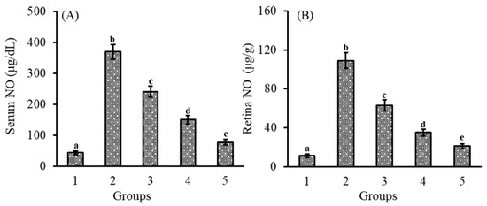 Nitric oxide production was indirectly assessed by measuring the level of nitrite in the serum and retina homogenate. Retina samples were homogenized and deproteinized by adding zinc sulfate, and the supernatant was obtained after centrifugation at 4000× g for 10 min at 4 °C. Subsequently, 100 µL of serum or retina supernatant was applied to a microtiter plate and mixed with 100 µL of Griess reagent (1% sulfanilamide, 0.1% naphthyl ethylenediamine di-hydrochloride, and 5% phosphoric acid). The mixture was incubated at RT for 10 min and the absorbance was read at 540 nm with a Micro-Reader (Molecular Devices E750, San Jose, CA, USA). The concentration of NO was calculated based on the standard curve of sodium nitrite.