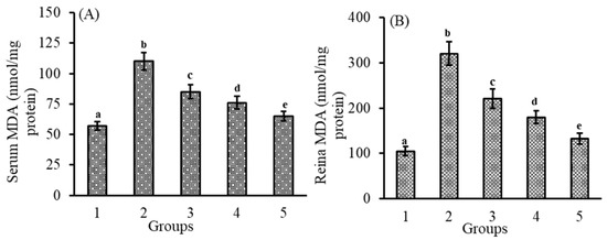 Effect of lutein-PLGA NCs (+PL)/(−PL) and micellar lutein on MDA levels in serum (A) and retina (B) of LD mice previously induced with LPS. Groups: 1 = control, 2 = LPS, 3 = micellar lutein, 4 = lutein-PLGA NCs (−PL), and 5 = lutein-PLGA NCs (+PL) intubated for 15 days. Values are mean ± SD (n = 6) and bars not sharing a similar superscript are significantly different (p < 0.05) among the groups.
