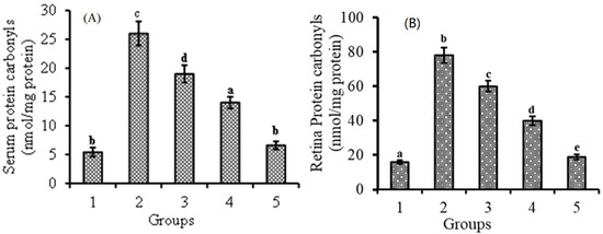 Effect of lutein-PLGA NCs (+PL)/(−PL) and micellar lutein on protein carbonyl levels in serum (A) and retina (B) of LD mice previously induced with LPS. Groups: 1 = control, 2 = LPS, 3 = micellar lutein, 4 = lutein-PLGA NCs (−PL), and 5 = lutein-PLGA NCs (+PL) intubated for 15 days. Values are mean ± SD (n = 6) and bars not sharing a similar superscript are significantly different (p < 0.05) among the groups.