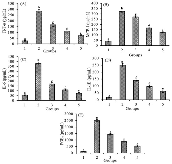 Effect of lutein-PLGA NCs (+PL)/(−PL) and micellar lutein on TNF-α (A), MCP-1 (B), IL-6 (C), IL-1B (D), and PGE2 (E) levels in serum of LD mice induced with LPS. Groups: 1—Control, 2—LPS, 3—Micellar lutein, 4—Lutein-PLGA NCs (−PL) and 5—Lutein-PLGA NCs (+PL). Values are mean ± SD (n = 5) and bars not sharing similar superscript are significantly different (p < 0.05).