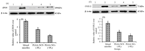 Protein expression pattern of iNOS (A) and COX-2 (C) in retina of LPS-induced LD mice. Lane 1—control, 2—LPS, 3—lutein-PLGA NCs (+PL), 4—lutein-PLGA NCs (-PL), 5—lutein. Relative values of iNOS (B) and COX-2 (D) over the control. Bars not sharing similar superscript are significantly different (p < 0.05).