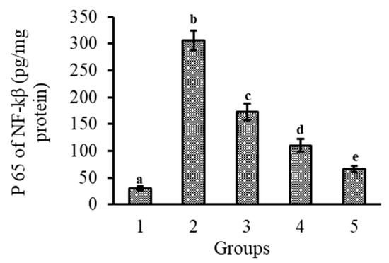 Effect of lutein-PLGA NCs (+PL)/(−PL) and micellar lutein on NF-κB p65 subunit activation in retina of LPS-induced LD mice. 1 = control, 2 = LPS, 3 = micellar lutein, 4 = lutein-PLGA NCs (−PL), and 5 = lutein-PLGA NCs (+PL). Mean ± SD (n = 5) and bars not sharing similar superscript are significantly different (p < 0.05).