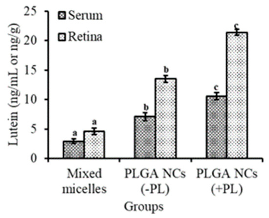 Bioavailability of lutein from lutein-PLGA NCs (+PL)/(−PL) and micellar lutein in the serum and retina of LPS-induced LD mice. Mean ± SD (n = 5) and bars not sharing similar superscript are significantly different (p < 0.05).