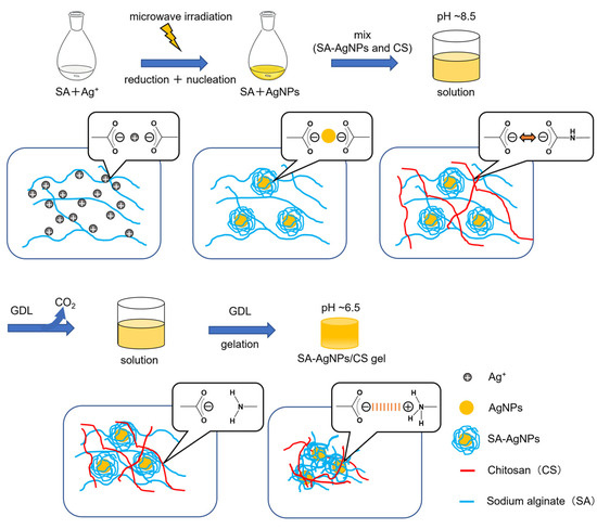 Schematic illustration of the SA-AgNPs/CS gel fabrication.