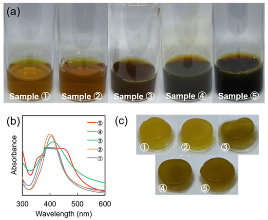 UV-vis spectroscopy, a simple and sensitive method, was used to characterize the SA-AgNPs by their excitation surface plasmons. Theoretical studies on the size dependence of metallic spheres on UV-visible absorption have indicated that the surface plasmon resonance band shows a red shift with increasing particle size and a blue shift with decreasing particle size [36]. Colloidal silver aggregation causes a decrease in the main peak’s intensity, with the appearance of an additional blue peak on the long wavelength side [37]. After the reaction without microwave irradiation, the color of the SA-AgNPs changed. Figure 2a–c show the SA-AgNP suspensions, their UV absorbance values, and the hydrogels fabricated using the suspensions. After the experiment had been five times, the SA-AgNP suspensions’ color, UV spectra, and hydrogels were unique each time. Particularly, the UV spectra of the solution, with a peak around 400 nm representing AgNPs, was observed only in experiments No. 1 (sample ①) and No. 2 (sample ②), whereas a peak at 410 nm corresponding to larger AgNPs was observed in experiment No. 3 (sample ③). Experiments No. 4 (sample ④) and 5 (sample ⑤) did not show any clear peaks. This could be due to the small amount of SA used, which was insufficient to simultaneously function as a reducing agent and a stabilizer. Although ascorbic acid was added to the system, the SA did not wholly coat the AgNPs in the system during the reaction. As this synthesis (without microwave irradiation) was not reproducible, SA-AgNPs were synthesized with microwave irradiation for the remaining experiments.