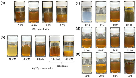 Colors exhibited by the SA-AgNP suspensions with (a) 50 mM AgNO3 at pH 9 and 80 °C, after 8 min of reaction with various SA concentrations; (b) 0.5% SA at pH 9 and 80 °C, after 8 min of reaction with various AgNO3 concentrations; (c) 0.5% SA and 50 mM AgNO3 at 80 °C and different pH values after 8 min of reaction; (d) 0.5% SA and 50 mM AgNO3 at pH 9 and 80 °C, with different irradiation times; and (e) 0.5% SA and 50 mM AgNO3 at pH 9 and different temperatures, after 8 min of reaction.