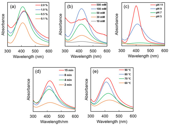 The effect of temperature on the morphology of AgNPs has been reported in previous studies [44]. As shown in Figure 4e, the formation of AgNP increased with the reaction temperature, and a slightly red-shifted peak was observed at a reaction temperature of 90 °C. This could be attributed to a disruption of the SA coating layer due to the agglomeration of AgNP because of the enhanced thermally induced molecular motion after the increase in the temperature.