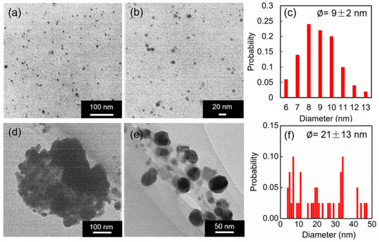 Figure 5 shows the TEM images of the SA-AgNP sample synthesized with 0.5% SA and 50 mM AgNO3 at pH 9 and 80 °C, after a reaction time of 8 min. A uniform dispersion of spherical SA-AgNPs was observed, with an average particle size of 9 ± 2 nm, indicating the significant role of SA as a stabilizer. Contrariwise, AgNPs without the SA coating exhibited self-agglomeration with larger diameters of 21 nm and a wider size dispersity of 13 nm. According to a report by Agnihotri et al., AgNPs with an average particle size of 5–100 nm exhibit antimicrobial properties against various bacteria, and those with particle sizes below 10 nm exhibit the best antibacterial activity against E. coli. [19]. Moreover, the spherical shape of AgNPs gives higher bactericidal efficacy against E. coli. than rod-shaped AgNPs [45]. The SA exhibited reducing and stabilizing properties; thus, the SA coating facilitated the production of high-stability uniform SA-AgNPs with an average diameter of 10 nm. The SA-AgNPs showed high antimicrobial activity [28]; thus, the SA-AgNPs synthesized here were expected to exhibit good antimicrobial activity.