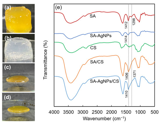 Digital photographs of (a) the SA-AgNPs/CS, (b) the SA/CS gel, (c) the mixture of SA-AgNPs and CS without NaHCO3 and GDL, and (d) the mixture of SA-AgNPs and CS with the addition of NaHCO3 without GDL. (e) The FTIR spectra of SA, the SA-AgNPs, CS, the SA/CS gel, and the SA-AgNPs/CS gel.