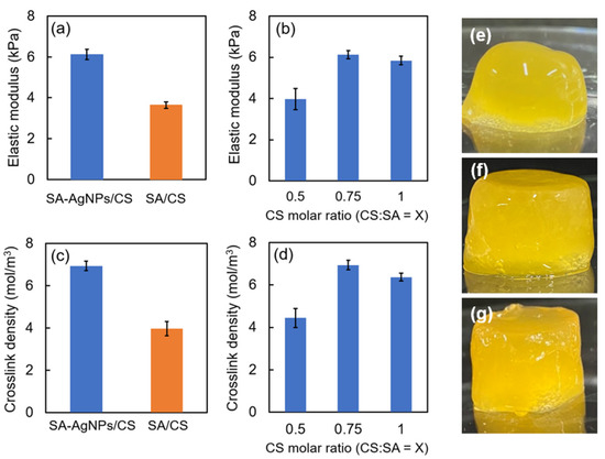 Young’s modulus of (a) the SA-AgNPs/CS and SA/CS gels (CS:SA = 0.75:1) and (b) the SA-AgNPs/CS gel with different molar ratios of CS:SA. Crosslinking densities of (c) the SA-AgNPs/CS and SA/CS gels (CS:SA = 0.75:1) and (d) the SA-AgNPs/CS gel with different molar ratios of CS:SA. Digital photographs of the SA-AgNPs/CS gel with different molar ratios of CS:SA: (e) CS:SA = 0.5:1, (f) CS:SA = 0.75:1, and (g) CS:SA = 1:1.