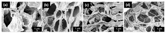 SEM images of (a) SA/CS (CS:SA = 0.75:1), (b) SA-AgNPs/CS (CS:SA = 0.5:1), (c) SA-AgNPs/CS (CS:A = 0.75:1), and (d) SA-AgNPs/CS (CS:SA = 1:1) gels.