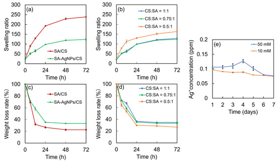 Swelling ratios of (a) the SA-AgNPs/CS and SA/CS gels, and (b) the SA-AgNPs/CS gel with different molar ratios of CS:SA. Residual weights of (c) the SA-AgNPs/CS and SA/CS gels (CS:SA = 0.75:1) and (d) the SA-AgNPs/CS gel with different molar ratios of CS:SA. (e) Concentration of Ag+ ions released from SA-AgNPs/CS gels fabricated using 50 and 10 mM AgNO3.