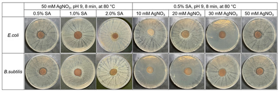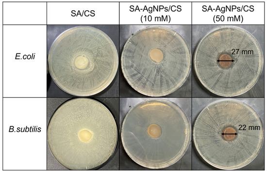 AgNPs exhibited antimicrobial effects against a variety of bacteria [49]. In this experiment, the antibacterial activity of the SA-AgNPs/CS gel was evaluated using the zone of inhibition method, with several conditions, as shown in Figure 10. All samples, except the sample obtained using 2% SA, showed an inhibition zone against E. coli and B. subtilis. Tokura et al. reported that the antimicrobial activity of a CS oligomer with a molecular weight of 9300 Da was likely caused by blocking the permeation of the nutrient through the cell wall of bacteria [50]. The SA/CS gel without AgNPs did not exhibit sufficient antibacterial activity (Figure 11), likely because the molecular weight of CS in this work was approximately 5.3 × 104 Da, which was too large and could only block the nutrition supply through the cell. Unlike the SA/CS gel, the SA-AgNPs/CS gels showed significant antimicrobial ability against E. coli and B. subtilis because of the combination of the antimicrobial abilities of both AgNPs and chitosan. The SA-AgNPs/CS gel fabricated with 10 mM AgNO3 showed 17 and 16 mm inhibition zones against E. coli and B. subtilis, respectively, whereas the gel synthesized with 50 mM AgNO3 (a final SA-AgNP concentration of 20 ppm) showed 25 and 21 mm inhibition zones against E. coli and B. subtilis, respectively. The average value and the standard deviation were calculated from three measurements and are reported in Table 2. According to a report by Chen et al., PVA/SA/carboxymethyl chitosan (PVA/SA/CMCS) hydrogels containing SA-AgNPs and synthesized using 0.05% AgNO3 with 0.2% SA at 90 °C without microwave irradiation required a 12 h synthesis time. The PVA/SA/CMCS hydrogels containing SA-AgNPs showed 21 and 20 mm inhibition zones against E. coli and S. aureus, respectively [33]. Herein, the SA-AgNP/CS hydrogel containing SA-AgNPs and synthesized using microwave irradiation with an 8 min synthesis time showed high antimicrobial activity against E. coli and B. subtilis. It should be emphasized that the reaction time was reduced using our method.