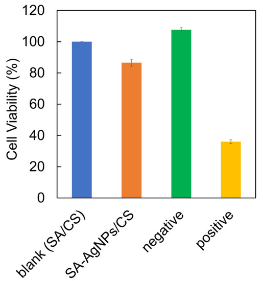 The FTIR spectra of the SA-AgNPs/CS gel before and after sterilization with EOG were used for the cytotoxicity experiment (Figure S1). The FTIR spectrum of the SA-AgNPs/CS gel did not change after sterilization. Chen et al. reported that PVA/SA/CMCS hydrogels containing SA-AgNPs synthesized using 0.05% AgNO3 with 0.2% SA at 90 °C for 12 h without microwave irradiation exhibited a cell survival rate of 80%, which was slightly lower than that without AgNPs, indicating low cell damage by the PVA/SA/CMCS/Ag hydrogels [33]. In this research, BALB-3T3 clone A31 cells (mouse fibroblasts) were used as the cell model to analyze the cytotoxicity of the SA-AgNPs/CS gel. Under the same conditions, the SA/CS gel extract was a blank, a HDPE film extract was a negative control, and a PU film with a 0.25% ZDBC extract was a positive control. The average value and the standard deviation were calculated from three measurements and are shown in Figure 12. The SA-AgNPs/CS gel with a final SA-AgNPs concentration of 20 ppm exhibited 87% cell viability, which was slightly lower than that of the blank (SA/gel). The cell survival rate was still high, especially when compared with that of the positive control. This finding was similar to that of other previous works [51]. Thus, it could be concluded that the SA-AgNPs have low toxicity towards living organisms at low concentrations.