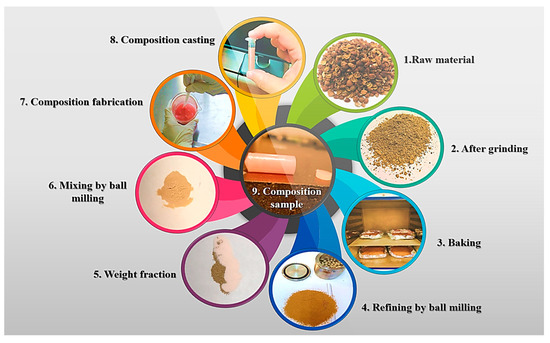 In the current study, a self-curing acrylic resin purchased from Protechno Famadent S.L.U. in Spain is used for quickly repairing and relining denture plates made from acrylic material. It is also suitable for hydroflasking both partial and full dentures. The resin comes in two parts: a white powder made of Poly(methyl methacrylate) or PMMA with a density of 1.18 g/cm3 and a colorless liquid monomer composed of methyl methacrylate (MMA) with a density of 0.94 g/cm3. According to the manufacturer’s data sheet, it has a flexure strength of 65.8 MPa and a Young’s modulus of 2263 MPa. The coffee husks were first ground into smaller pieces using a mortar and pestle. Then, a grain miller was used to pulverize the pieces at 200 RPM. The obtained powder was switched to the ball-milling jar (Pulverisette 7, Fritsch, Idar-Oberstein, Germany). The machine was set to rotate at 200 RPM, and the milling process lasted 8 h, with 15 milling and 15 min rests to prevent excessive heat buildup in the jar.