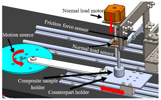 The tribological tests were conducted to investigate the tribological characteristics of PMMA/coffee husk composites under dry sliding conditions at 27 °C and 60% relative humidity. A reciprocating pin-on-disk tribometer, shown in Figure 2, was utilized where an 8 mm diameter and 25 mm length PMMA/coffee husk pin slides against a rectangular disk made of stainless steel or a part of cow bone, and the tests were conducted according to ASTM G99-95 [29]. The study seeks to evaluate the tribological properties of the proposed PMMA composite as a spacer, and, consequently, a real cow bone was used during the tribology test. Before each experiment, the stainless steel and cow bone surfaces were cleaned using acetone and dried with a heat gun to eliminate any contaminants. Additionally, the PMMA/coffee husk composite specimens were ultrasonically washed with acetone and dried before starting every experiment. The friction experiments were conducted under fixed sliding speed of 0.4 m/sec, using different normal loads of 5, 10, 15, and 20 N. The wear of each specimen was determined by calculating the weight difference before and after the test. To ensure accurate results, each experiment was repeated five times under the same load conditions, and the average was determined while considering the standard errors. Following the tribological experiments, the morphology of the rubbed surfaces was evaluated with the aid of an SEM microscope (JCM-6000Plus; JEOL, Tokyo, Japan). To improve the samples’ conductivity, a thin layer of platinum was applied to all surfaces of the composite samples before conducting the scanning.