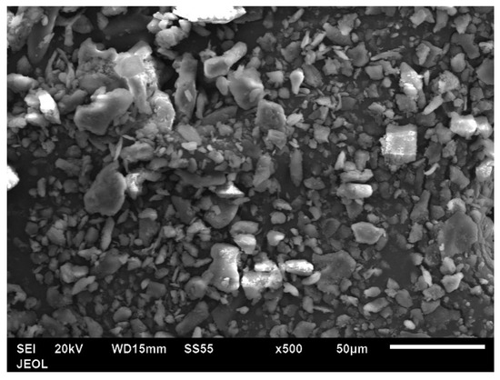 As previously indicated, the coffee husk powder was ground in two stages. The final condition of the coffee husk powder is shown in Figure 4, which displays an SEM image of the coffee husk particle morphology. The date pit particles have an irregular, equiaxed shape and a rough surface. Additionally, some particles were found to have significantly smaller sizes and were observed to be clustered.