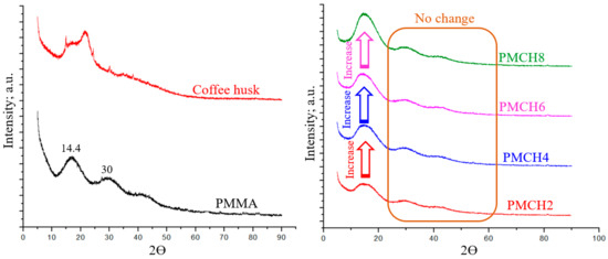 The XRD analysis of pure PMMA showed three broad peaks with a high intensity at 2θ of 14.4 and a low intensity at 30 and 41.8, which were also observed for all PMMA/coffee husk composites. These peaks indicate the amorphous nature of the PMMA polymer [31]. These observations are consistent with the results presented by Hashem et al. [32] for PMMA. The XRD pattern of the prepared coffee husk showed two main well-defined peaks. The first peak with a low intensity at 2θ of 15, which corresponds to the crystallographic plane (110) [33], and the second peak with a high intensity at 2θ of 22.02 corresponds to the crystallographic plane (200) [34]. The XRD analysis of the coffee husk shows an ordered structure that is identical with cellulose type I, which has Ic of 33.04% [35]. The XRD analysis of the PMMA/coffee husk composites showed that the addition of the coffee husk did not affect the structural properties of PMMA, suggesting that there was no chemical reaction between the two components and that the coffee husk was only physically mixed with PMMA.