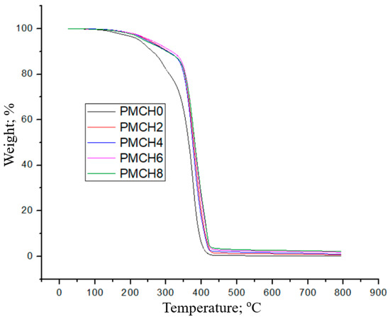 Figure 6 demonstrates the thermal stability of both PMMA and PMMA/coffee husk composites by applying TGA analysis. The results indicate that PMMA and its composites started to lose weight at 150 °C, and about 90% of the weight loss occurs at 420 °C, which shows that the incorporation of coffee husk into the PMMA has a negligible effect on PMMA’s thermal stability. These results could be attributed to the addition of a low-weight fraction of coffee husk, which would not significantly impact the thermal characteristics of the composite. However, a slight enhancement in thermal stability is observed by adding 8 wt.% coffee husk. This increase in stability could be due to the increased number of active sites, which could raise the decomposition temperature of the composite [36].