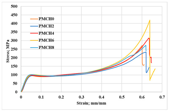 Compressive stress–strain diagram of pure PMMA and PMMA/coffee husk composites.