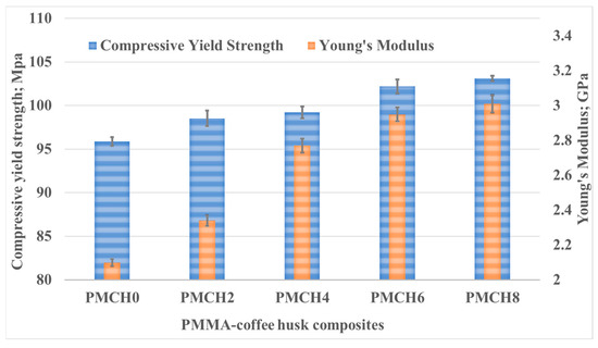 During the compression tests of PMMA composites with varying weight fractions of coffee husk, the stress and corresponding strain were recorded, as shown in Figure 7. The results reveal that the incorporation of coffee husk in different loading fractions had a significant impact on the compressive characteristics of PMMA, which led to an enhanced performance compared to pure PMMA. Figure 8 illustrates the effect of the coffee husk incorporation on the Young’s modulus and compressive yield strength of the PMMA composites. Increasing the content of coffee husk led to an improvement in the Young’s modulus and compressive yield strength of the PMMA composites. The PMMA composite containing 8 wt.% coffee husk was the best in terms of yield strength. Young’s modulus and compressive yield strength increased by 43.33% and 7.56%, respectively, compared with pure PMMA. The improvement in compressive yield strength can be attributed to the homogenous distribution of coffee husk particles within the PMMA matrix, which enabled the matrix to transfer the compressive load to the coffee husk powder and dissipate it. Additionally, during compression testing of polymers, filler particles can help prevent the propagation of cracks in the matrix as they begin to form [37]. A comparison of the fracture surface of the PMMA composite with 8% coffee husk loading (PMCH8) to pure PMMA, as shown in Figure 9, revealed distinct differences in the fractographic patterns. The fracture surface of pure PMMA showed significant cracks, which can lead to deterioration in the material and a decrease in the mechanical properties. However, the PMCH8 composite showed fewer cracks and a rough surface. The increase in surface roughness indicates that the crack path has been distorted by the presence of the coffee husk particles, which depicts an improvement in the strength of the PMMA/coffee husk composite.