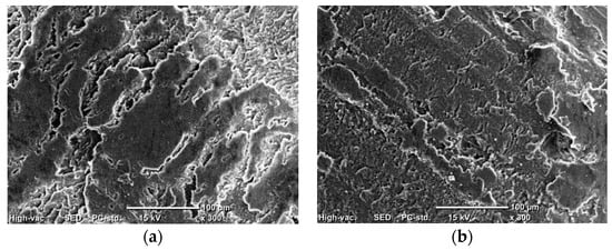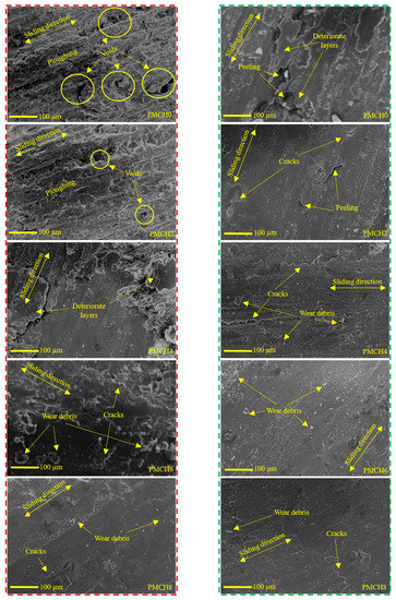 To further understand the improved wear characteristics of the PMMA/coffee husk composites, the worn surfaces of the PMMA composite samples were examined using SEM, as shown in Figure 17. The red rectangle in Figure 17 represents the worn surface of the PMMA/coffee husk composites tested against the stainless-steel disk, while the green rectangle represents the worn surface of the composites tested against the cow bone disk. The worn surface of pure PMMA (PMCH0) showed significant degradation with numerous eliminated and deteriorated layers, large voids, and peeling. This degradation was caused by the plowing of the PMMA surface during the rubbing, leading to a marked increase in weight loss (wear). The eliminated layers were weak, increasing the shear resistance and subsequently the friction coefficient [45]. The wear mechanism is evident as a delamination mechanism, which is known to increase the wear and friction coefficient [46]. The SEM photographs of the PMMA composites containing coffee husk filler show smoother surfaces than pure PMMA, indicating that the coffee husk filler improved the strength of the composite surfaces, reducing wear loss and the friction coefficient of the PMMA composite. However, as the weight fraction of coffee husk increased, changes occurred in the wear mechanism.