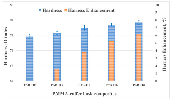 The hardness of the PMMA composite samples with varying amounts of coffee husk was evaluated using the shore D index, as shown in Figure 10. As the percentage of coffee husk increased, the hardness of the composites also increased. The highest enhancement in hardness, about 6%, was observed for the composite with 8 wt.% coffee husk (PMCH8) compared to pure PMMA. This increase in hardness is attributed to the better distribution of coffee husk particles within the PMMA matrix [38], which improves the intermolecular bonds and load transfer between the matrix and the filler. Additionally, the higher proportion of coffee husk in the composite also results in increased stiffness. Furthermore, the enhancement in hardness can also be attributed to the increase in stiffness due to the increasing proportion of coffee husk.