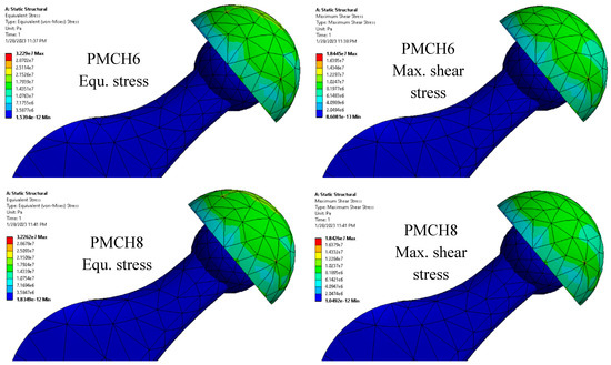It is evident that using coffee husk particles in the PMMA matrix enhances its mechanical properties. As the composite is intended to be used as a spacer, it is crucial to evaluate its load-bearing capability under realistic conditions. Researchers have determined this by assessing the contact stresses on the surface of the parts that come into contact under specific conditions [39]. An ANSYS model of the hip joint incorporating the spacer was created to achieve this. The stresses generated on the spacer surface due a person standing are demonstrated in Figure 11. The specific conditions for these calculations are outlined in Section 2.4 and are shown in the red rectangle in Figure 11. The amount of stress created on the spacer’s outer and inner surfaces is also shown. The greatest amount of stress was observed on the spacer’s inner surface where it is in direct touch with the hip joint ball head. The FE analysis shows that an inconsiderable change in the equivalent stress and the maximum shear stress occurred with the variation of coffee husk weight fraction in PMMA, which affected the mechanical properties, as shown in Figure 12. The increase in the content of coffee husk resulted in a decrease in both generated stresses, which is consistent with the improvement in the measured mechanical characteristics. The decrease in the contact stresses indicates an increase in load-carrying capacity [40]. Additionally, the highest equivalent stress generated is 32.78 MPa, which is roughly half of the ultimate compressive stress as determined in experiments, making it safe to use these new composites to produce the spacer.