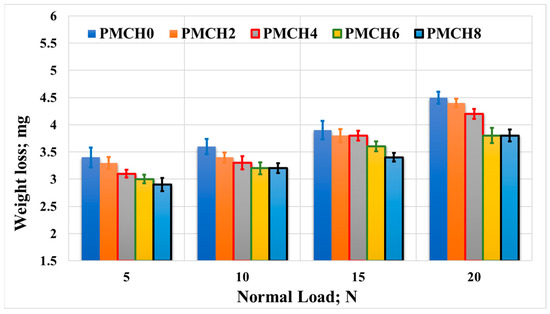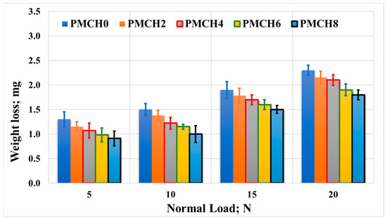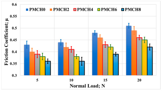 The results from the friction tests are presented in Figure 13, which displays the average coefficient of friction plotted against the normal load applied when rubbing the PMMA/coffee husk composites against a stainless steel disk. The results show that the incorporation of coffee husk led to a reduction in the coefficient of friction compared to pure PMMA. At a normal load of 5 N, PMCH8 displayed the lowest coefficient of friction (0.51), representing a 9% reduction compared to pure PMMA (0.56). With the increase in the applied normal load, the reduction in the coefficient of friction between PMHA0 and PMHA8 ranged from 12% to 14%. Additionally, the friction coefficient gradually increased upon increasing the applied normal load, which could be attributed to the temperature rising at the contact surfaces during the rubbing process [41]. This increase in temperature may increase the adhesion among the contact surfaces [42].