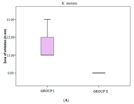 (A) Zone of inhibition against S. mutans in groups I and II. (B) Zone of inhibition against F. nucleatum in groups I and II.