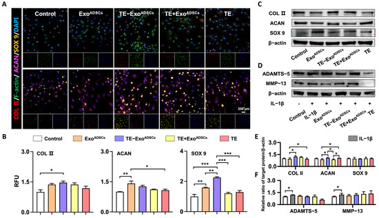To further clarify the potential of TE-ExoADSCs on ECM synthesis, ACs (5 × 104 cells) were seeded into cell slides filled with ExoADSCs, TE-ExoADSCs, TE+ ExoADSCs, or TE solution (20 µg/mL). The cells were incubated for 48 h at 37 °C, and the expression of collagen II (COL Ⅱ), SOX 9, and aggrecan (ACAN) was measured with immunofluorescence staining and Western blot.