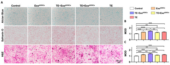 Alcian blue and safranin O staining were performed to verify the cartilage matrix deposition in the chondrocytes. As shown in Figure 3A–C, the TE-ExoADSCs group exhibited the strongest staining intensity and expressed increasing levels of GAGs compared to the control group. H&E staining revealed that the chondrocytes in the TE-ExoADSCs group displayed more noticeable blue nuclei that were ovoid, and pink cytoplasm that was triangular or spindle-shaped. These findings suggested that TE-ExoADSCs more effectively stimulated chondrocyte regeneration and cartilage ECM deposition.