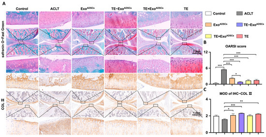 A rat model of OA induced by ACLT was utilized to examine the protective role of TE-ExoADSCs suspension on the articular cartilage. HE, safranin O/fast green, and COL II immunohistochemical stains were applied to identify cartilage structural damage and proteoglycan loss (Figure 4 and Figure 5). According to the example pictures in Figure 4A and Figure 5A, articular cartilage was significantly diminished following ACLT surgery. In contrast to the ExoADSCs, TE+ ExoADSCs, and TE injection groups, the TE-ExoADSCs-treated knee joints of ACLT-induced OA rats exhibited full cartilage integration with a smooth surface, expression levels of ACAN, and the regular organization of chondrocytes.