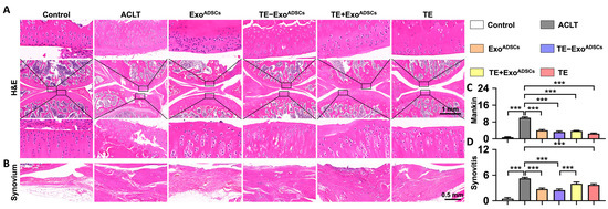 Intra-articular injection of TE-ExoADSCs effectively protected cartilage matrix and inhibited synovium inflammation. (A,B) H&E staining of rat knee joints and synovium. Images of femur and tibia were from black boxed area. In H&E staining images, red represents cytoplasm and blue represents cell nucleus. (C) Statistical analysis of the Mankin score in cartilages (n = 5, *** p < 0.001). (D) Statistical analysis of synovitis scores (n = 5, *** p < 0.001).