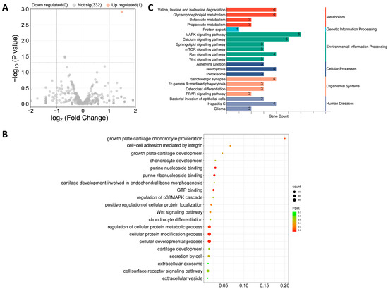 miR-451-5p was enriched in TE-ExoADSCs, indicated by exosomal miRNA sequencing. (A) Volcano plot displaying the one significant differentially expressed miRNA based on the criteria of p < 0.05 and fold change > 1.0. (B) GO pathway enrichment analysis of the target genes of miR-451-5p. (C) KEGG pathway enrichment analysis of the target genes of miR-451-5p.