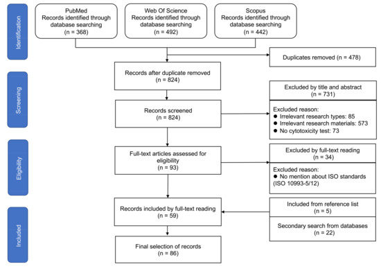 The inclusion criteria were studies in the English language that conducted cytotoxicity assessment of biodegradable Zn or its alloys, in which experiments were implemented according to the ISO (International Organization for Standardization) 10993-5 or 10993-12 standards. The exclusion criteria were review articles, clinical studies, in vivo animal studies, case reports, retrospective studies, editorials, opinions, guidelines, conferences, and commentary articles.