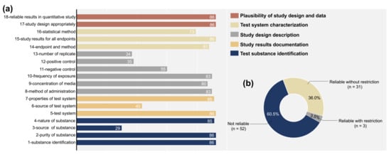 Results of quality assessment of included articles using the ToxRTool: (a) total score for each item of the ToxRTool in vitro criteria; (b) articles classified into three categories on the basis of quality evaluation results (reliable without restriction, reliable with restriction, and not reliable).