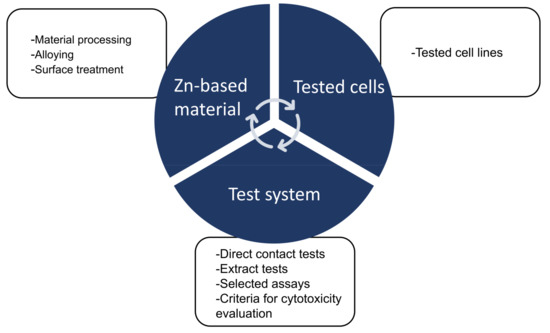 Schematic diagram of the assessment of the toxic effects of biodegradable Zn and its alloys according to three factors: Zn-based materials, tested cells, and test system.