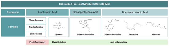 Therefore, the resolution of an inflammatory response can be explained in a simplistic way as a molecular switch of the lipid mediators from the production of pro-inflammatory mediators, such as LTs and PGs, to anti-inflammatory mediators originating from the same precursor. These anti-inflammatory mediators are collectively called specialized pro-resolving mediators (SPMs) [16].
