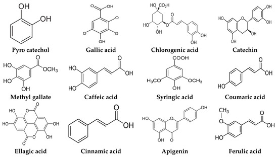 A. nilotica flower (Figure 1A) extract was subjected to HPLC analysis, and the incidence of different phenolic and flavonoid constituents with different retention times, concentrations, area and area % (Figure 1B and Table 1), and chemical formulas was determined (Figure 2). Three compounds were recognized in the extract with great quantity: 5451.04, 4572.26 and 3733.37 µg/mL for ferulic acid, chlorogenic acid and quercetin, respectively. Other detected compounds such as rutin (2393.13 µg/mL) and gallic acid (2116.77 µg/mL) were reported with moderate concentrations. Cinnamic acid (69.72 µg/mL), hesperetin (121.39 µg/mL) and methyl gallate (140.45 µg/mL) were distinguished with the lowest quantity. Moreover, other compounds in the extract, including catechin, caffeic acid, syringic acid, pyro catechol, ellagic acid, apigenin daidzein and coumaric acid were detected. Unfortunately, eight unidentified compounds were present in the extract due to the defect of the standard compounds in the HPLC system. On the other hand, some compounds including vanillin, naringenin and kaempferol were not found in the extract. There are differences in the detected phenolic and flavonoid compounds according to the organ, the geographical location of the cultivation area, the extraction methods and the nutritional and climatic condition of the plant. Sayed et al. [41] recorded the presence of catechin, catechin 7-O-gallate, gallic acid, naringenin 7-O-β-glucopyranoside and quercetin in A. nilotica flower extract. The major detected compounds in A. nilotica ripe fruits were gallic acid methyl ester, followed by catechin and catechin-7-gallate [42]. In another recent study, Kaur et al. [4] studied the phytoconstituents of A. nilotica bark extract via HPLC, showing the existence of numerous phenolic constituents such as ferulic acid, myricetin, kaempferol, rutin, quercetin, gallic acid, betulin, catechin and epicatechin. The extracted A. nilotica flowers with aqueous methanol reflected the presence of gallic acid, catechin, 7-Galloyl catechin, quercetin 3-O-rhanmnopyranosyl (1→6) glucopyranoside, quercetin-3-O-α-L-rhamnopyranoside, quercetin 3-O-β-glucopyranoside and quercetin [29]. Several studies have focused on the biological activities of the natural phenolic and flavonoid molecules in the fields of pharmaceutics and nutrition. Most of the detected compounds in the extract have been shown to have anticancer, antimicrobial, antioxidant, anti-inflammatory and anti-diabetic properties, but these were illustrated in studies that were conducted on other plants. Yersinia enterocolitica was inhibited by chlorogenic acid [43]. Quercetin exhibited therapeutic potential for treating inflammation, Alzheimer, diabetes and cancer, showing some antioxidant activities [44,45]. Rutin was also reported in inflammation and thrombosis treatments [46].