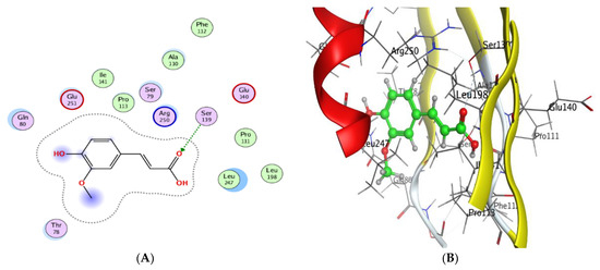 Ferulic acid, which was the highest detected compound in the A. nilotica flower extract, was investigated against 4HI0 protein of H. pylori. The goal of molecular docking, an optimization issue, is to identify the ligand binding mode that has the lowest potential energy. The target binding site’s coordinate space was sampled during docking, and each potential ligand, which had been posed within that site, was scored. The ligand posture with the highest score was then used to forecast the binding mode for that chemical. A 2D molecular structure of ferulic acid has been assigned to the MOE (Molecular Operating Environment), which was designed to visualize the active sites of the complexes (protein–ligand) (Figure 4A–F). The ligand was arranged and rendered using an improved version of the 2D algorithm layout representation, and the protein residues were arranged around it to indicate spatial proximity bonds. The obtained results revealed that ferulic acid was a good inhibitor for the (4HI0) enzyme to slow the progression of H. pylori. Ferulic acid has been found to interact with the residue’s SER 139 active site via the O 29 atom and had a low energy score (−5.58 Kcal/mol), which was important for their biological activity (Table 4 and Table 5). The increased negative score of the free binding energy in the current study confirmed the mechanism of bacterial growth inhibition by ferulic acid. This result was in agreement with recent studies [24,56].
