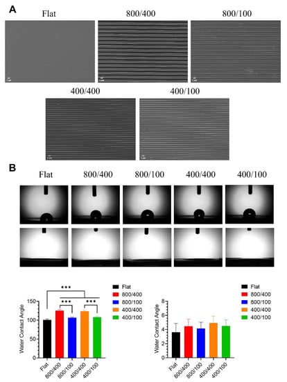 (A) Surface morphology of different submicron-grooved and flat films observed by SEM; scale bars are 1 µm. (B) Water contact angles detected on different samples without (above) or with (below) air plasma treatment and the corresponding statistical analysis. *** represent p < 0.001, respectively (n = 3).