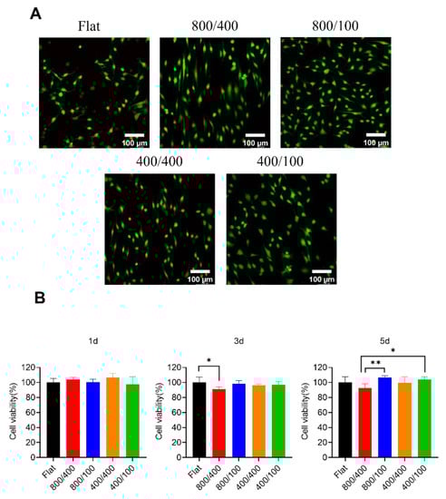 Both live–dead staining and CCK-8 assays were performed to evaluate the viability of Schwann cells cultured on different samples. After 2 days of culturing on different submicron-grooved films, Schwann cells were stained with Calcein-AM and PI. Figure 2A shows the images of live–dead stained cells, and no significant difference can be found between the different groups. The abundant green fluorescence of viable cells demonstrates the excellent cytocompatibility of the groove samples. The CCK-8 assay evaluated the proliferation of the Schwann cells after 1, 3, and 5 days of culturing on the four samples. The proliferation analysis of the Schwann cells, shown in Figure 2B, indicates a minimal variation between the grooved and flat films at different cell culture times, and only the cell viability determined on the 800/400 grooved film is slightly lower than the other groups at day 5.