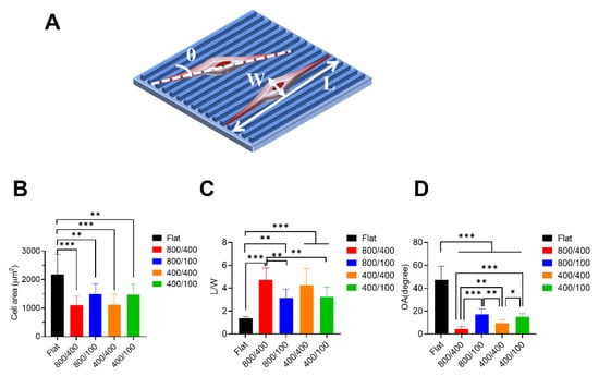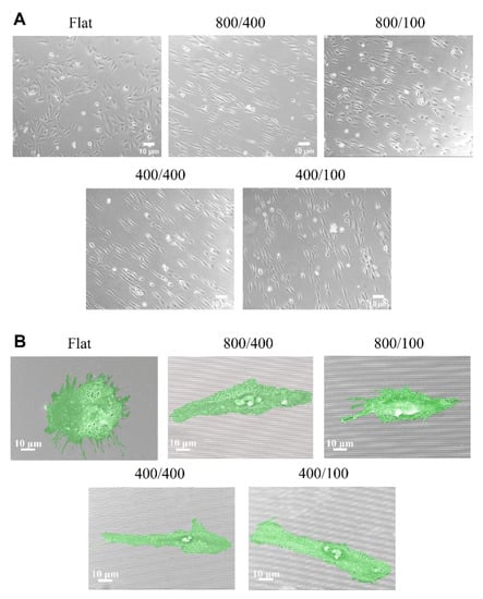 Surface wettability is another critical factor affecting cell adhesion. Therefore, water contact angles are measured on different submicron-grooved films with or without air plasma treatment using a contact angle measurement instrument. As depicted in Figure 1B,C, all the samples exhibit an explicit hydrophobicity with water contact angles greater than 90°. Notably, the water contact angle measured on the submicron-grooved films is considerably larger than that determined on the flat films. With increased groove depth, the water contact angle progressively rises to approximately 110° (800/100 and 400/100) and 120° (800/400 and 400/400). After plasma treatment, the grooved patterns became superhydrophilic due to a lateral capillary force inside the grooves, which is consistent with a previous study [37].