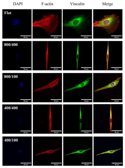 In a next step, the effect of submicron grooves on the adhesion and skeleton of Schwann cells is evaluated by immunofluorescence staining. After the Schwann cells adhered to the submicron-grooved films for 24 h, the cells were immunofluorescence-stained with phalloidin and vinculin antibodies and observed under a laser confocal microscope. As shown in Figure 5, the F-actin microfilament structure of the Schwann cells forms bundles that elongate along the grooves, which is quite different from that observed on the flat film. Moreover, vinculin is evenly distributed at both ends of the elongated cells on the grooves, whereas it is primarily located around the nuclei of the Schwann cells cultured on the flat surface. These findings suggest that the groove structure can reshape the cytoskeletal structure and influence the distribution of adhesion proteins.