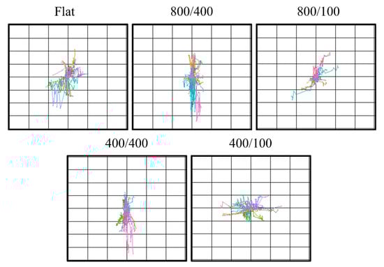 To evaluate the cell migration, cell positions were captured every hour within 24 h after cells seeding on different samples. The cell movement trajectory is displayed in the X/Y axis coordinate plot (Figure 6), with the origin (0, 0) as the starting point. The results show that most of the Schwann cells migrate linearly along the Y-axis direction on the 800/400 and 400/400 grooves, and the movement of the Schwann cells is relatively less directional on the 400/100 and 800/100 grooves. In contrast, the movement of the Schwann cells on the flat surface was non-directional. These findings suggest that the depth of the grooves plays an essential role in directing the migration of Schwann cells.