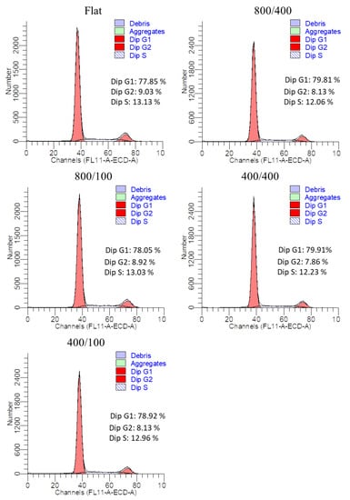 After 5 days of culturing, the Schwann cells cultured on different samples were stained with PI. Then, the cell cycle was analyzed using flow cytometry. As depicted in Figure 7, the G1 phase is predominant for the Schwann cells cultured on both the grooved and flat samples, with no noticeable differences among them. The highest percentage of Schwann cells in the G2 phase can be observed on the flat sample (9.03%), followed by the 800/100 grooves (8.92%), while minimal differences can be observed among the 800/400, 400/400, and 400/100 groups (7.86–8.13%). The S phase is the DNA synthesis phase of cells. According to the results, the percentage of Schwann cells in the S phase is slightly higher in the flat (13.13%), 800/100 (13.03%), and 400/100 (12.96%) groups compared to the 800/400 (12.06%) and 400/400 (12.23%) groups. Our findings suggest that the depth relative to the width of the grooves has a slight effect on the cell cycle of Schwann cells.
